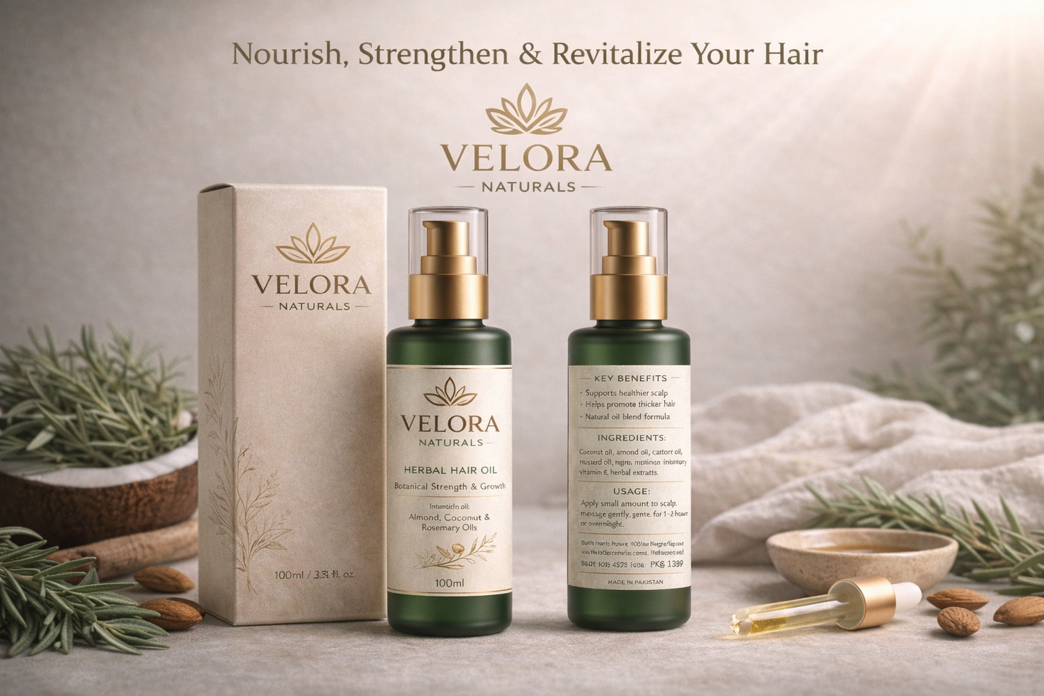 Velora Naturals herbal hair oil combines nutrient-rich natural oils that nourish the scalp, strengthen roots, and support healthier hair growth. Designed for daily use without heaviness or stickiness.